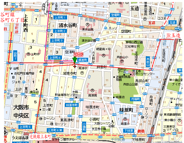 | 近鉄線で・・・上本町6丁目の交差点上町筋を北へ(大阪城の方向へ)(近鉄百貨店を背に) ケンタッキーを右に見えると左へ)よけわからんがな!3つ目の交差点上本町4(右手に中華料理)を 東(右)へ2つ目の交差点手前右側、美吉屋(財布屋)と看板が上がっています。 |